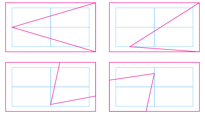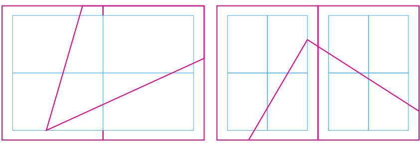 Als één vlak (voorbeeld links) worden de boven genoemde richtlijnen toegepast zoals beschreven: marge rondom en de twee middenlijnen. Als twee vlakken (beeld rechts) zijn er marges en middenlijnen op de twee pagina’s. Hierdoor kan de verderkijker om meerdere punten ontstaan. In beide gevallen kan de verderkijker doorlopen van een pagina naar de andere, maar alles in het tweede geval kan de verderkijker binnen één pagina afgesneden worden.
