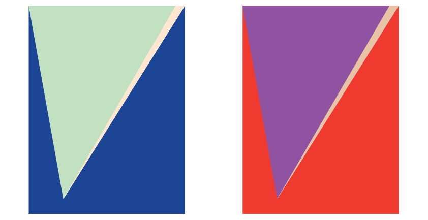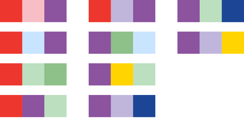 We maken gebruik van de volgende kleurencombinaties. Elke combinatie bevat rood en/of paars. Binnen één middel kan er gevarieerd worden met de combinaties mits de combinaties niet naast elkaar te zien zijn: op één spread gebruiken we één combinatie, niet één per pagina.